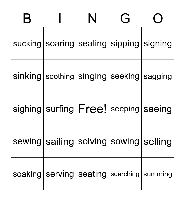 This bingo card has a free space and 24 words: sailing, serving, singing, soaking, signing, sucking, sinking, soaring, seeping, solving, seeking, sighing, sowing, selling, soothing, searching, seeing, sealing, sagging, surfing, summing, sewing, sipping and seating.