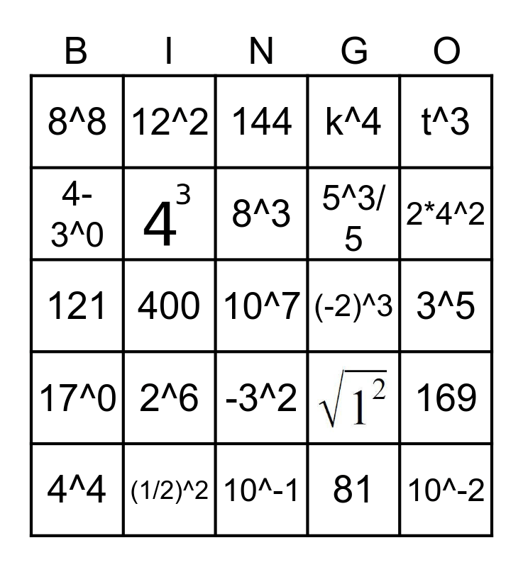 This bingo card has 2 images and 23 words: 2^6, 10^-1, 8^3, 4^4, t^3, 8^8, 4-3^0, 12^2, (-2)^3, -3^2, 5^3/ 5, 121, 169, 10^-2, 3^5, 144, 2*4^2, 400, 10^7, (1/2)^2, 17^0, k^4 and 81.