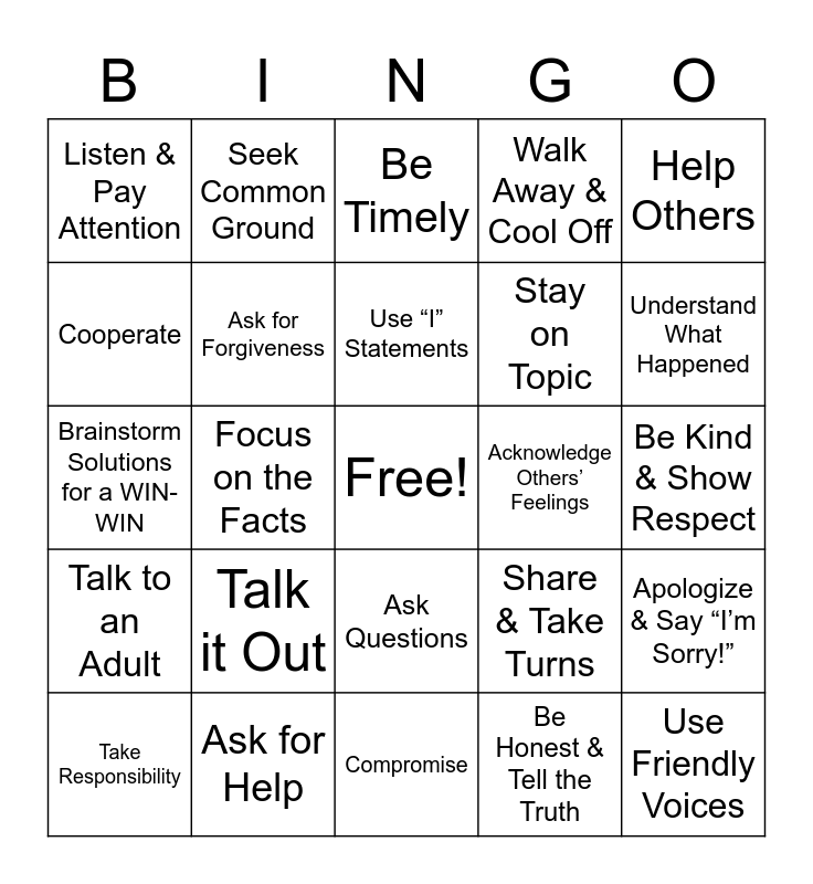 This bingo card has a free space and 24 words: Talk it Out, Ask for Help, Use “I” Statements, Take Responsibility, Help Others, Listen & Pay Attention, Cooperate, Seek Common Ground, Acknowledge Others’ Feelings, Ask Questions, Stay on Topic, Brainstorm Solutions for a WIN-WIN, Share & Take Turns, Apologize & Say “I’m Sorry!”, Ask for Forgiveness, Be Honest & Tell the Truth, Be Kind & Show Respect, Be Timely, Understand What Happened, Focus on the Facts, Use Friendly Voices, Talk to an Adult, Walk Away & Cool Off and Compromise.