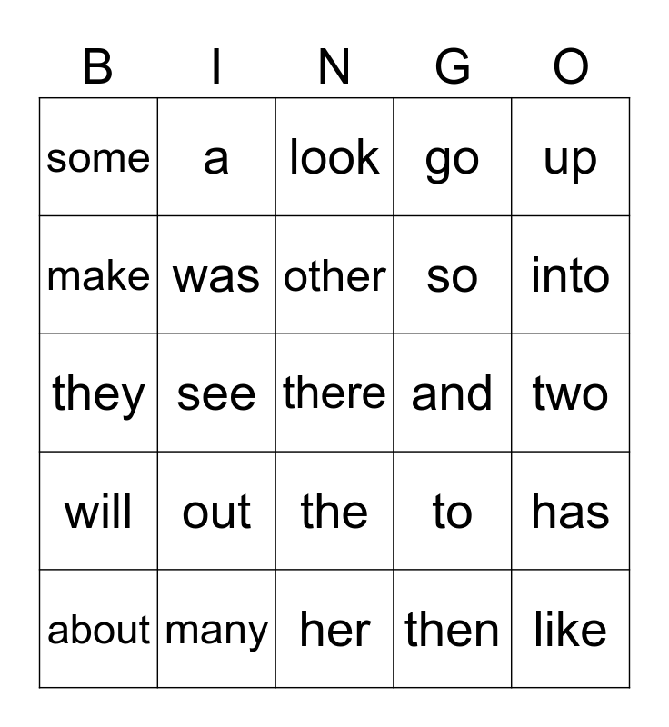 This bingo card has a free space and 24 words: out, many, other, about, up, some, make, a, and, the, so, they, to, has, was, then, two, look, into, see, like, will, go and her.