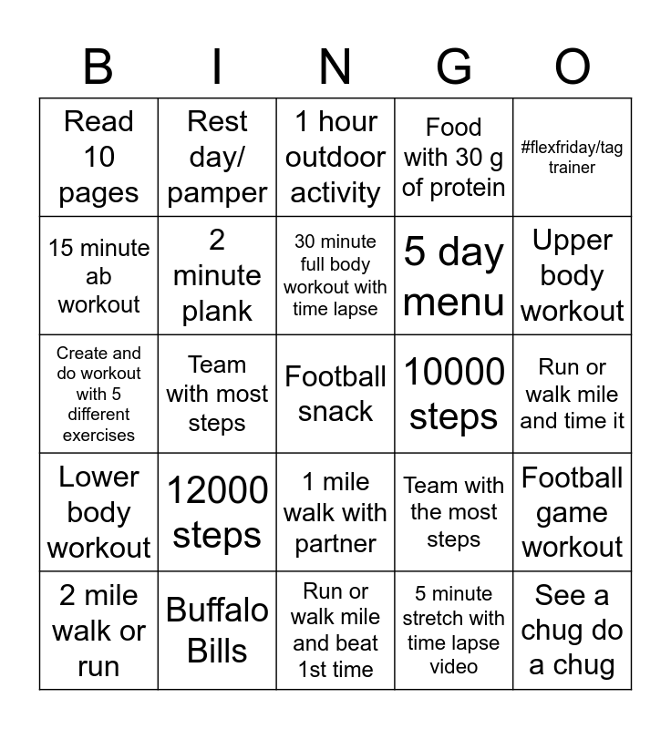This bingo card has a free space and 24 words: 12000 steps, Buffalo Bills, 30 minute full body workout with time lapse, 2 mile walk or run, #flexfriday/tag trainer, Read 10 pages, 15 minute ab workout, Rest day/ pamper, 10000 steps, 1 mile walk with partner, 5 day menu, Create and do workout with 5 different exercises, Team with the most steps, Football game workout, 2 minute plank, 5 minute stretch with time lapse video, Run or walk mile and time it, 1 hour outdoor activity, Upper body workout, Team with most steps, See a chug do a chug, Lower body workout, Food with 30 g of protein and Run or walk mile and beat 1st time.
