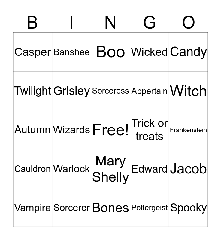 This bingo card has a free space and 24 words: Warlock, Sorcerer, Sorceress, Vampire, Candy, Casper, Twilight, Banshee, Trick or treats, Mary Shelly, Appertain, Autumn, Edward, Jacob, Grisley, Poltergeist, Frankenstein, Boo, Witch, Wizards, Spooky, Cauldron, Wicked and Bones.