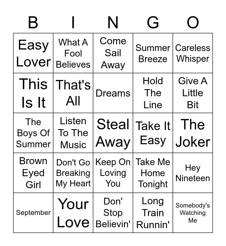 This bingo card has 30 words: Your Love, Everybody Wants To Rule The World, Listen To The Music, You Can Call Me Al, Easy Lover, Come Sail Away, That's All, Keep On Loving You, Take It Easy, Don' Stop Believin', The Joker, Steal Away, Long Train Runnin', Somebody's Watching Me, Give A Little Bit, Jack & Diane, Take Me Home Tonight, Brown Eyed Girl, Don't Go Breaking My Heart, Careless Whisper, The Boys Of Summer, You Make My Dreams (Come True), What A Fool Believes, Hold The Line, This Is It, Summer Breeze, Hey Nineteen, September, Dreams and Africa.