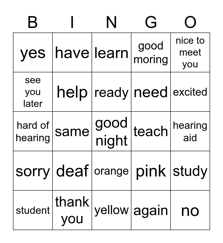 This bingo card has a free space and 59 words: name, thank you, please, sorry, again, ASL, help, want, need, bathroom, good moring, good afternoon, see you later, what's up, how are you?, yes, no, nice to meet you, number, ready, teach, learn, student, study, tired, emotions, school, number, excited, bored, embarrassed, stressed, sad, happy, have, like, don't like, same, hearing, hard of hearing, cochlear, deaf, hearing aid, bad, school, start, color, favorite, orange, yellow, blue, green, purple, gray, red, pink, black, white and brown.