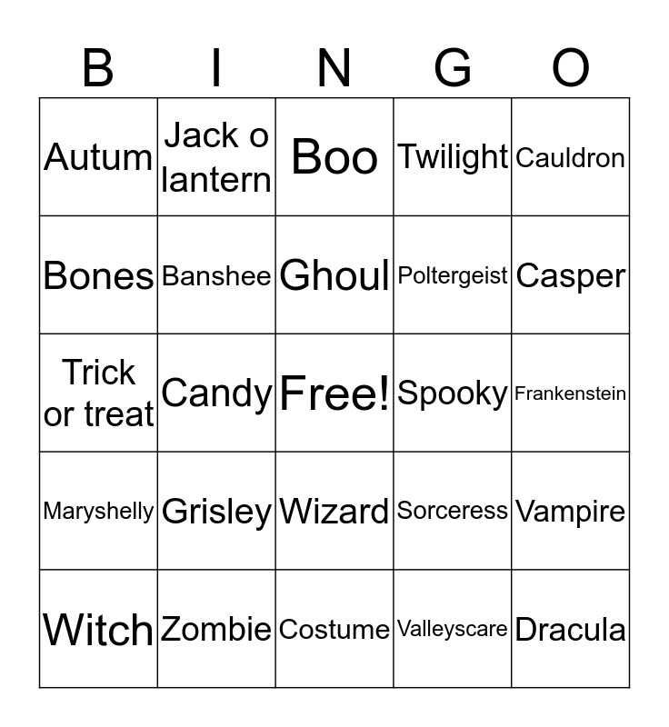 This bingo card has a free space and 24 words: Grisley, Zombie, Ghoul, Witch, Cauldron, Autum, Bones, Jack o lantern, Spooky, Wizard, Poltergeist, Trick or treat, Sorceress, Vampire, Banshee, Valleyscare, Frankenstein, Boo, Casper, Candy, Dracula, Maryshelly, Twilight and Costume.