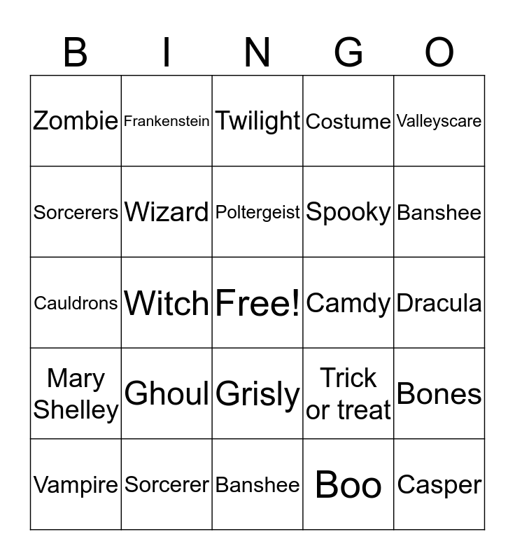 This bingo card has a free space and 24 words: Ghoul, Sorcerer, Poltergeist, Vampire, Valleyscare, Zombie, Sorcerers, Frankenstein, Camdy, Grisly, Spooky, Cauldrons, Trick or treat, Bones, Wizard, Boo, Dracula, Twilight, Banshee, Witch, Casper, Mary Shelley, Costume and Banshee.