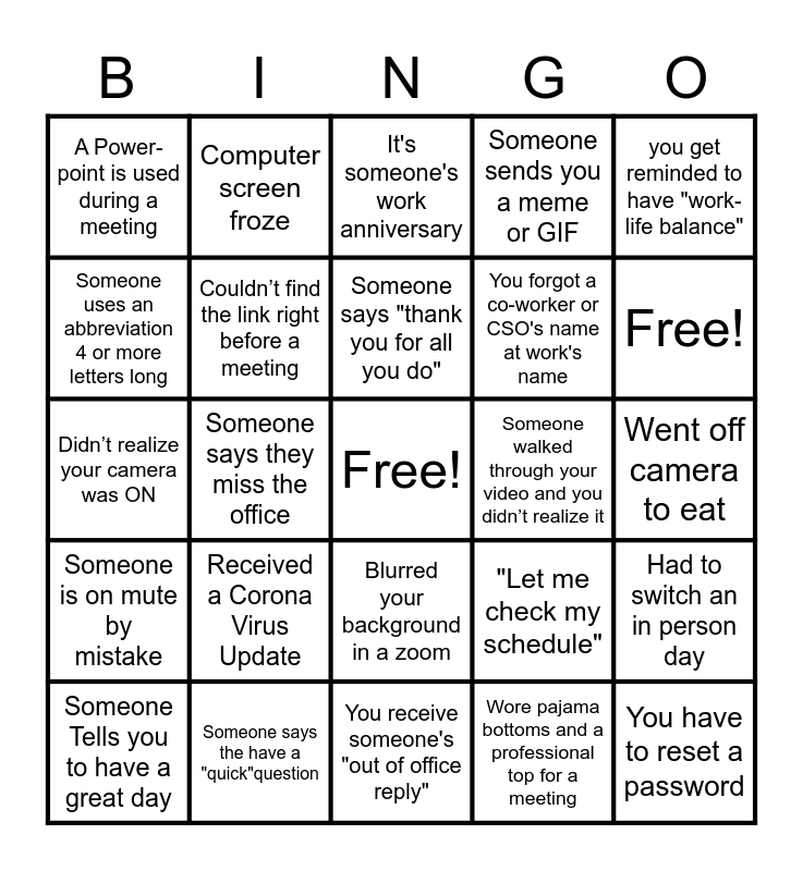 This bingo card has a free space and 24 words: Received a Corona Virus Update, Someone says the have a "quick"question, Someone says "thank you for all you do", Someone Tells you to have a great day, you get reminded to have "work-life balance", A Power-point is used during a meeting, Someone uses an abbreviation 4 or more letters long, Computer screen froze, Someone walked through your video and you didn’t realize it, Blurred your background in a zoom, You forgot a co-worker or CSO's name at work's name, Didn’t realize your camera was ON, "Let me check my schedule", Had to switch an in person day, Couldn’t find the link right before a meeting, Wore pajama bottoms and a professional top for a meeting, Went off camera to eat, It's someone's work anniversary, Free!, Someone says they miss the office, You have to reset a password, Someone is on mute by mistake, Someone sends you a meme or GIF and You receive someone's "out of office reply".
