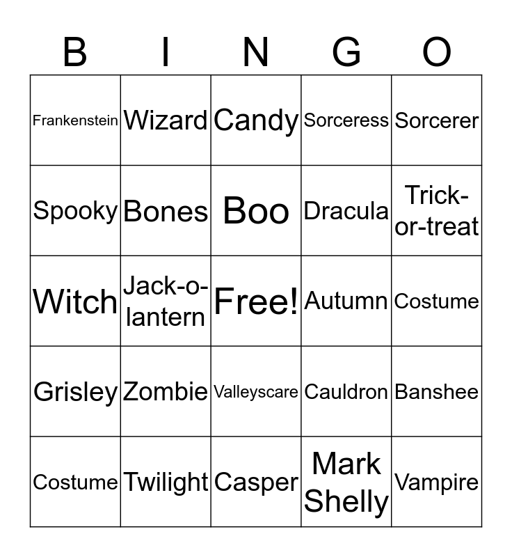 This bingo card has a free space and 24 words: Zombie, Twilight, Boo, Costume, Sorcerer, Frankenstein, Spooky, Wizard, Autumn, Valleyscare, Dracula, Witch, Cauldron, Banshee, Bones, Mark Shelly, Costume, Candy, Trick-or-treat, Jack-o-lantern, Vampire, Grisley, Sorceress and Casper.