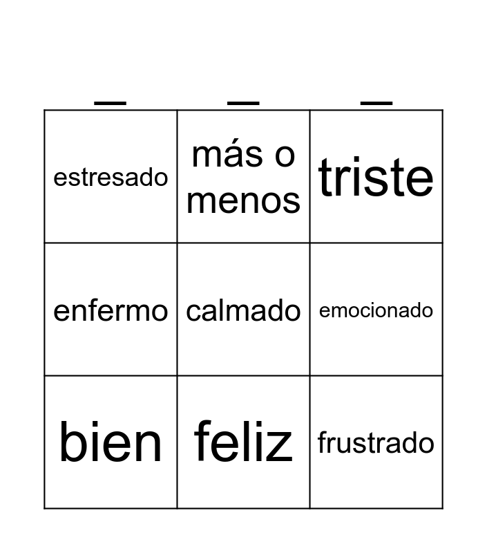 This bingo card has a free space and 10 words: feliz, triste, estresado, frustrado, enfermo, bien, más o menos, enojado, emocionado and cansado.