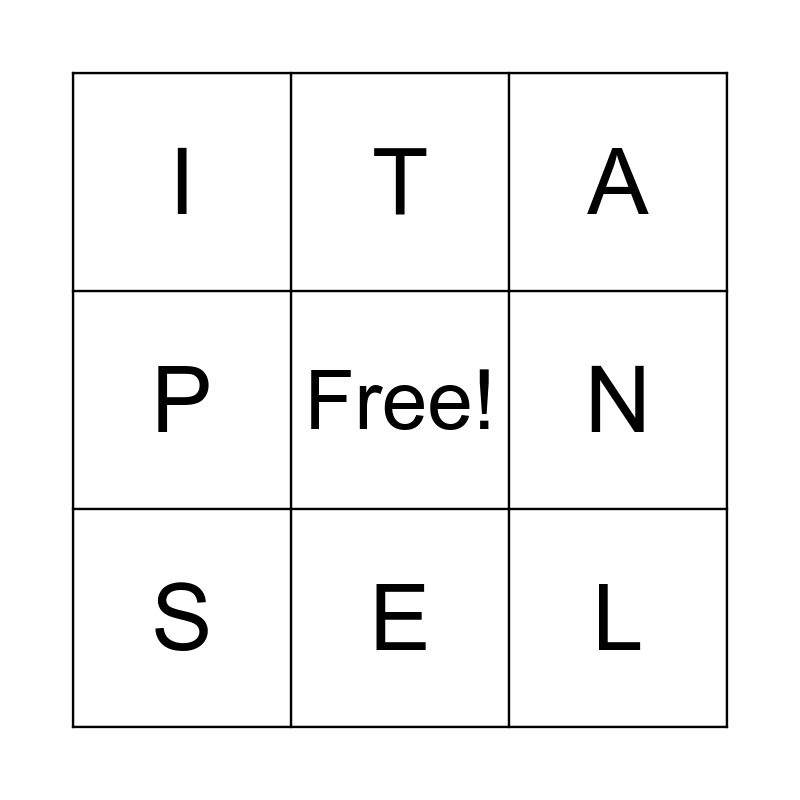 This bingo card has a free space and 9 words: S, A, T, P, I, N, L, K and E.