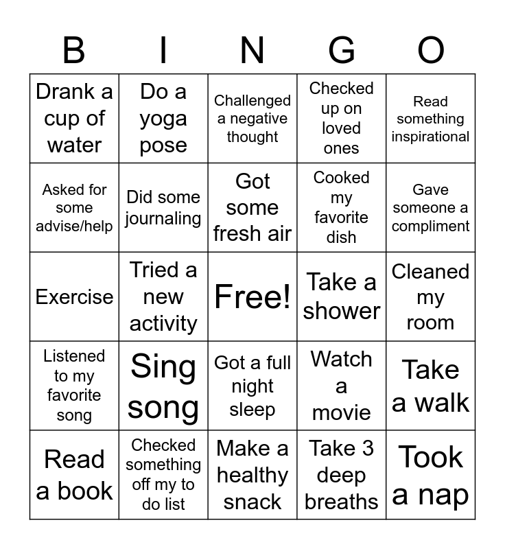 This bingo card has a free space and 25 words: Read a book, Sing song, Got some fresh air, Take 3 deep breaths, Gave someone a compliment, Drank a cup of water, Do a yoga pose, Challenged a negative thought, Cooked my favorite dish, Take a walk, Exercise, Did some journaling, Watch a movie, Took a nap, Asked for some advise/help, Checked something off my to do list, Make a healthy snack, Checked up on loved ones, Cleaned my room, Listened to my favorite song, Tried a new activity, Got a full night sleep, Take a shower, Read something inspirational and Ate my favorite dessert.