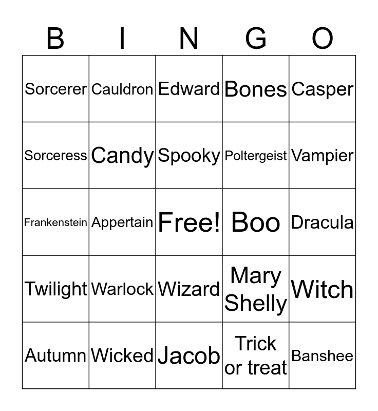 This bingo card has a free space and 24 words: Warlock, Wicked, Spooky, Autumn, Casper, Sorcerer, Sorceress, Cauldron, Boo, Wizard, Poltergeist, Frankenstein, Mary Shelly, Witch, Candy, Trick or treat, Dracula, Edward, Vampier, Appertain, Banshee, Twilight, Bones and Jacob.