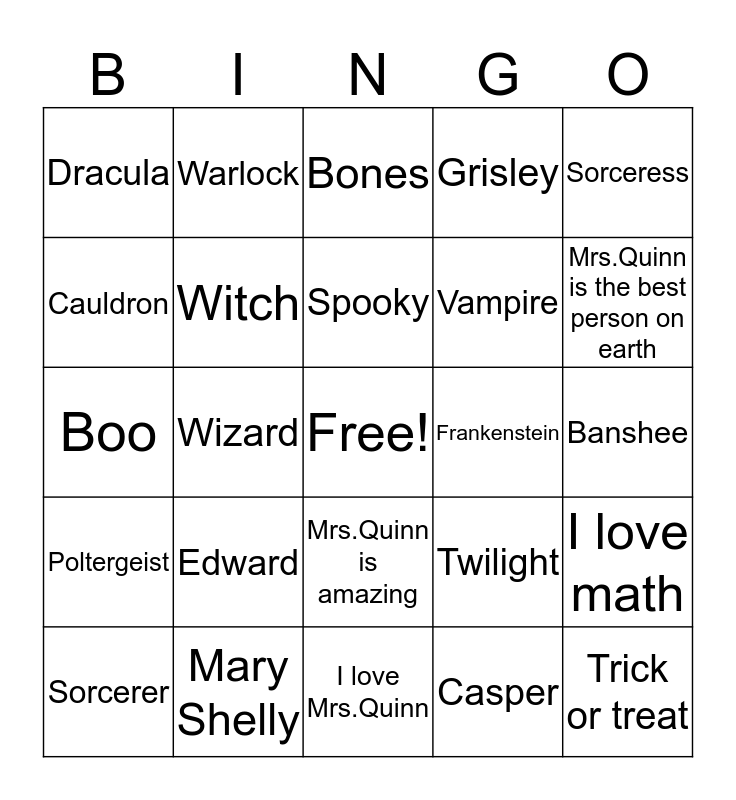 This bingo card has a free space and 24 words: Edward, Mary Shelly, Spooky, Sorcerer, Sorceress, Dracula, Cauldron, Warlock, Frankenstein, Mrs.Quinn is amazing, Vampire, Boo, Twilight, I love math, Witch, Casper, Banshee, Bones, Mrs.Quinn is the best person on earth, Wizard, Trick or treat, Poltergeist, Grisley and I love Mrs.Quinn.