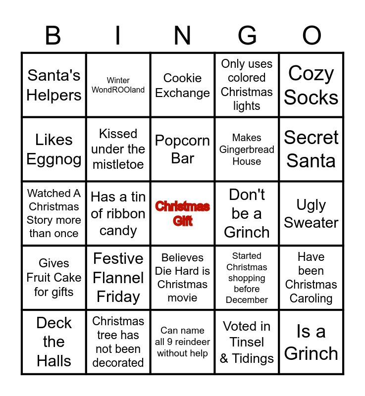 This bingo card has a free space and 24 words: Deck the Halls, Festive Flannel Friday, Popcorn Bar, Voted in Tinsel & Tidings, Cozy Socks, Santa's Helpers, Winter WondROOland, Cookie Exchange, Don't be a Grinch, Ugly Sweater, Watched A Christmas Story more than once, Kissed under the mistletoe, Started Christmas shopping before December, Have been Christmas Caroling, Likes Eggnog, Christmas tree has not been decorated, Can name all 9 reindeer without help, Only uses colored Christmas lights, Secret Santa, Gives Fruit Cake for gifts, Has a tin of ribbon candy, Believes Die Hard is Christmas movie, Makes Gingerbread House and Is a Grinch.