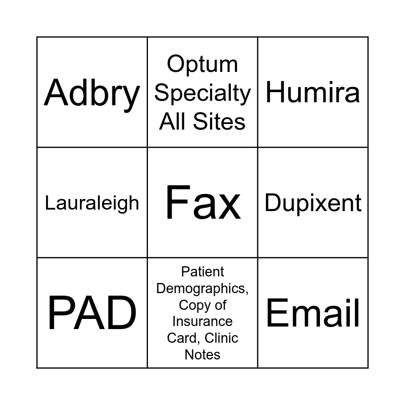 This bingo card has 13 words: 55455 Contact, Nickie Hayes, PAD, Optum Specialty All Sites, Lauraleigh, Fax, Email, Free Space, Patient Demographics, Copy of Insurance Card, Clinic Notes, Adbry, Dupixent, Humira and Rinvoq.