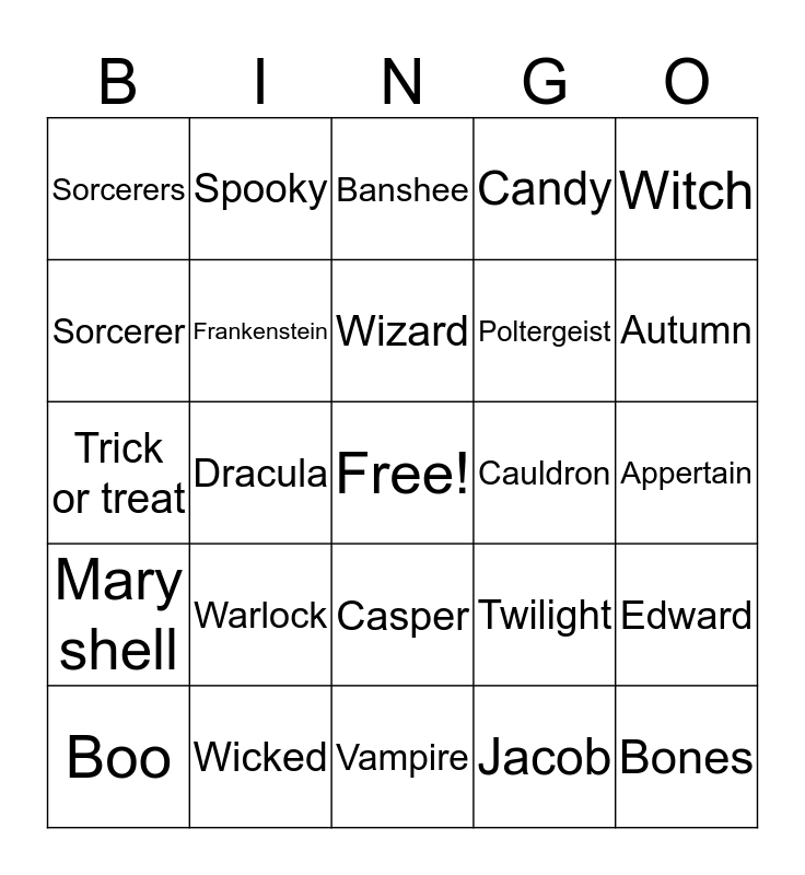 This bingo card has a free space and 24 words: Warlock, Wicked, Wizard, Boo, Witch, Sorcerers, Sorcerer, Spooky, Cauldron, Casper, Poltergeist, Trick or treat, Twilight, Edward, Frankenstein, Jacob, Appertain, Banshee, Autumn, Dracula, Bones, Mary shell, Candy and Vampire.