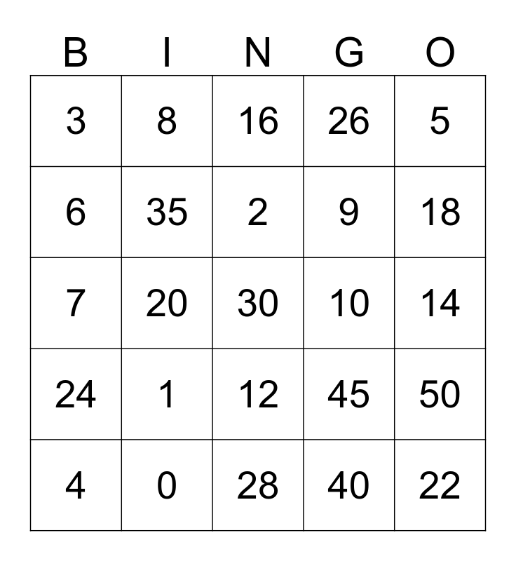This bingo card has a free space and 24 words: 1, 0, 2, 4, 5, 3, 6, 8, 10, 12, 9, 7, 45, 50, 35, 40, 14, 16, 18, 20, 22, 24, 26 and 28.