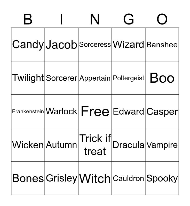 This bingo card has a free space and 24 words: Autumn, Grisley, Appertain, Bones, Banshee, Candy, Twilight, Jacob, Edward, Trick if treat, Poltergeist, Frankenstein, Dracula, Vampire, Sorcerer, Cauldron, Casper, Sorceress, Boo, Warlock, Spooky, Wicken, Wizard and Witch.