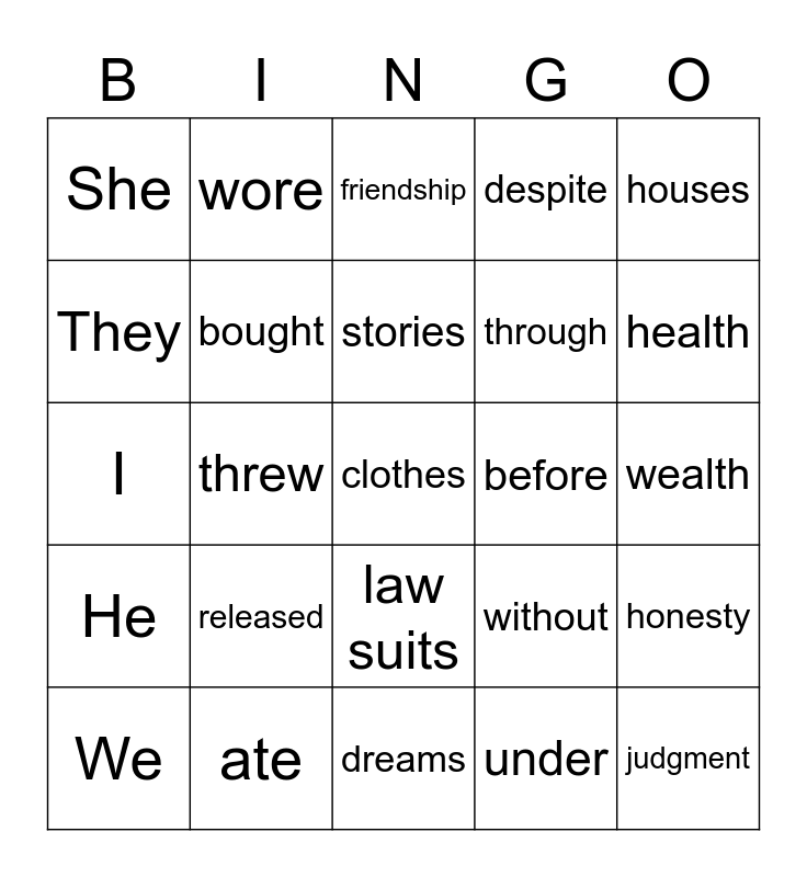 This bingo card has 25 words: He, ate, clothes, under, houses, She, wore, friendship, before, honesty, They, bought, dreams, without, health, We, threw, stories, through, wealth, I, released, law suits, despite and judgment.