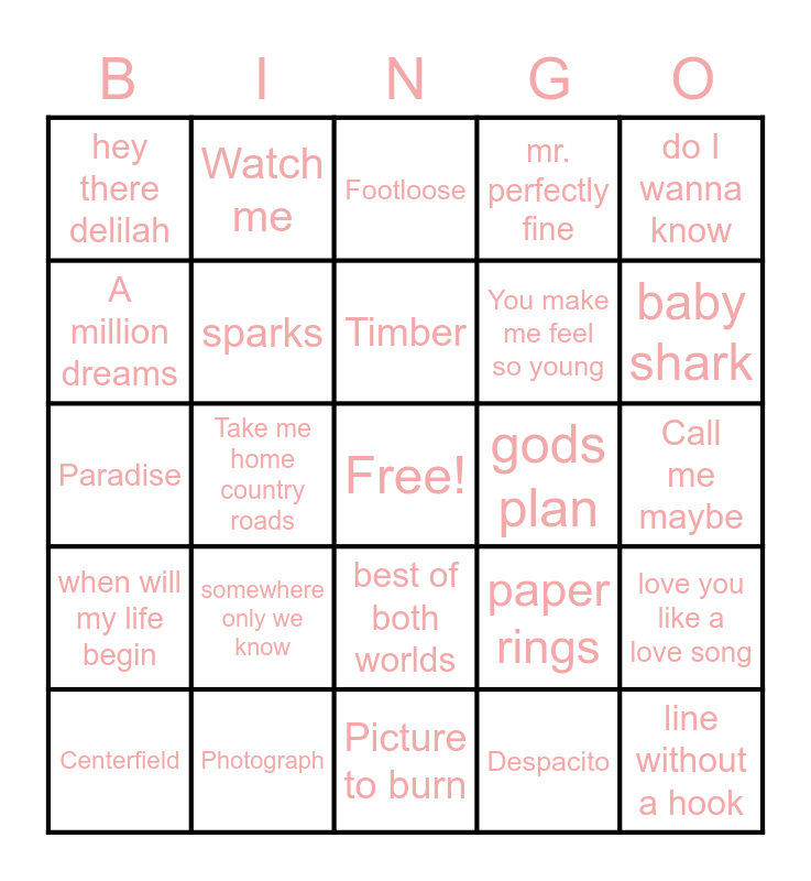 This bingo card has a free space and 100 words: Sorry, Uptown girl, Call me maybe, All too well, Watermelon sugar, We are young, Kick the dust up, Oops i did it again, Someone like you, Counting stars, halo, Livin on a prayer, traitor, Photograph, Beat it, style, You make me feel so young, wonder, music for a sushi restaurant, summertime sadness, just the way you are, golden, don’t stop me now, In my feelings, cake by the ocean, gods plan, do I wanna know, paper rings, hotline bling, when i was your man, Take me home country roads, hey there delilah, just the two of us, I don’t wanna fall in love, Despacito, Timber, love you like a love song, I can go the distance, Ain’t No mountain high enough, Thunderstruck, Stereo hearts, Body like a backroad, Paradise, Dynamite, baby shark, Footloose, midnight memories, Die young, lost in japan, Picture to burn, Someone to you, keep your head up, the power of love, shut up and dance, New romantics, She's so gone, Eye of the tiger, Rude, Pompeii, mr. perfectly fine, vivir mi vida, Teenage dream, Try Everything, little talks, good time, rude boy, exit music, a sky full of stars, enchanted, Blessed the broken road, life is a highway, somewhere only we know, dirty harry, Africa, friends on the other side, adore you, treasure, A million dreams, Before he cheats, Take me to church, chicago, line without a hook, Unwritten, best of both worlds, Wait for it, Watch me, Beautiful Soul, Hooked on a feeling, Royals, when will my life begin, Jolene, Wannabe, take on me, Centerfield, sparks, cruel summer, if only, happier, memories and the sweet escape.