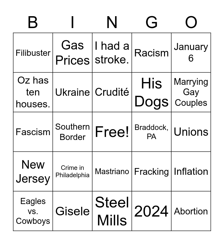 This bingo card has a free space and 24 words: Crime in Philadelphia, Gisele, Crudité, Eagles vs. Cowboys, January 6, Filibuster, Oz has ten houses., Gas Prices, Braddock, PA, Mastriano, His Dogs, Fascism, Fracking, Inflation, Ukraine, 2024, Unions, I had a stroke., Marrying Gay Couples, Southern Border, Abortion, New Jersey, Racism and Steel Mills.