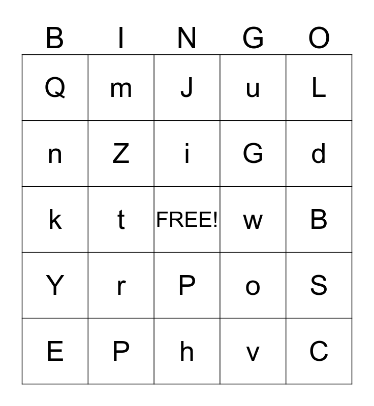This bingo card has a free space and 24 words: r, P, i, E, L, Q, n, m, w, P, G, k, o, S, Z, v, B, J, d, t, C, Y, u and h.