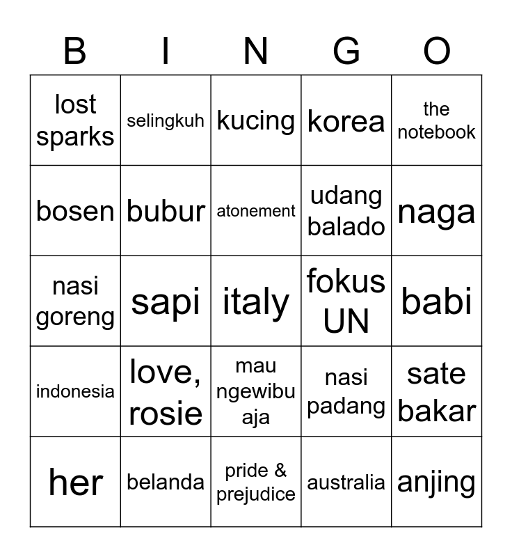 This bingo card has 25 words: love, rosie, pride & prejudice, atonement, her, the notebook, lost sparks, bosen, selingkuh, fokus UN, mau ngewibu aja, udang balado, nasi goreng, nasi padang, sate bakar, bubur, anjing, babi, kucing, naga, sapi, italy, belanda, indonesia, korea and australia.