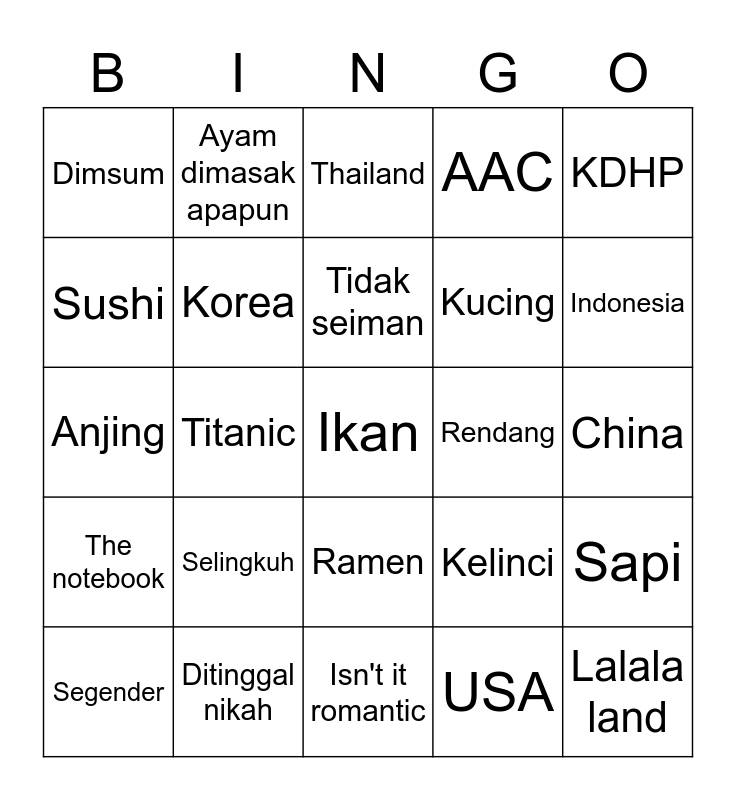 This bingo card has a free space and 24 words: Selingkuh, Ditinggal nikah, Tidak seiman, Segender, KDHP, Dimsum, Sushi, Ayam dimasak apapun, Rendang, Ramen, Kucing, Anjing, Kelinci, Sapi, Korea, USA, China, Thailand, Indonesia, Titanic, Lalala land, The notebook, AAC and Isn't it romantic.