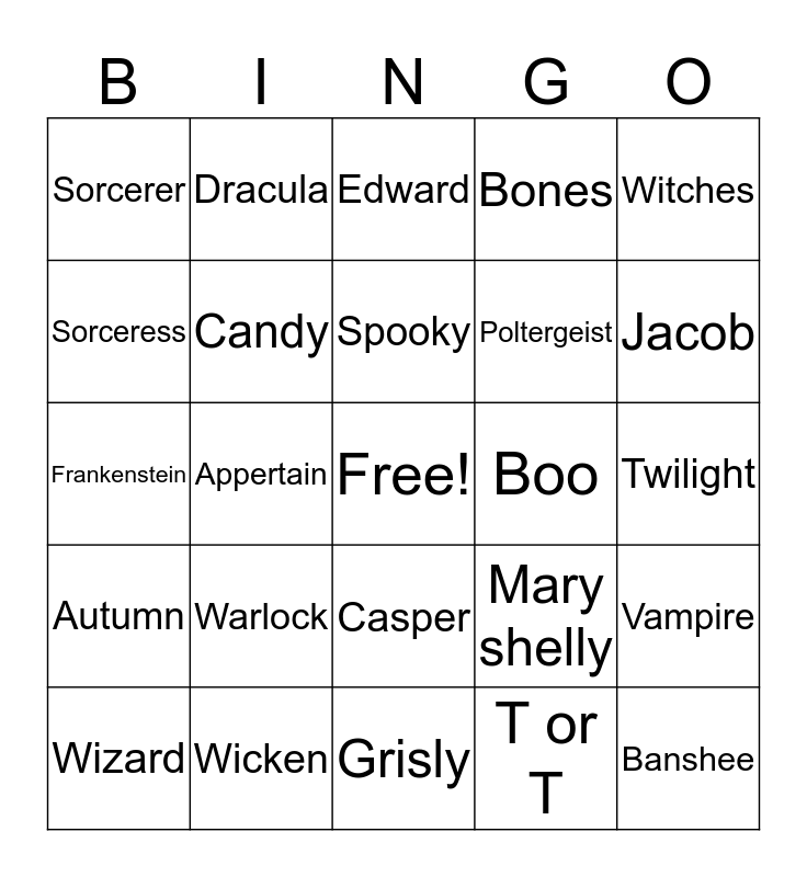 This bingo card has a free space and 24 words: Warlock, Wicken, Spooky, Wizard, Witches, Sorcerer, Sorceress, Dracula, Boo, Casper, Poltergeist, Frankenstein, Mary shelly, Vampire, Candy, T or T, Twilight, Edward, Jacob, Appertain, Banshee, Autumn, Bones and Grisly.