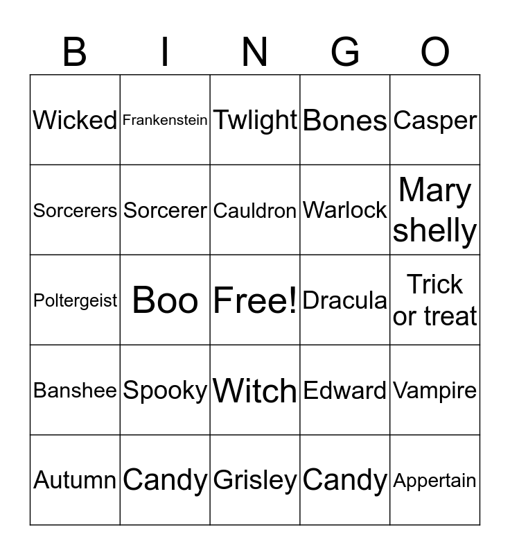 This bingo card has a free space and 24 words: Spooky, Candy, Cauldron, Autumn, Casper, Wicked, Sorcerers, Frankenstein, Dracula, Witch, Warlock, Poltergeist, Edward, Vampire, Sorcerer, Candy, Trick or treat, Twlight, Mary shelly, Boo, Appertain, Banshee, Bones and Grisley.
