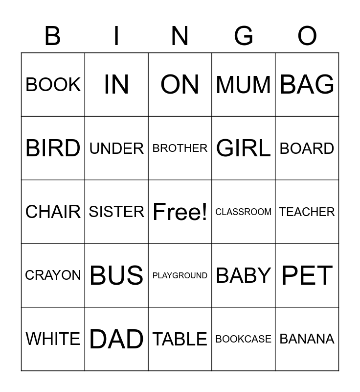 This bingo card has a free space and 24 words: BUS, DAD, BROTHER, WHITE, BAG, BOOK, BIRD, IN, CLASSROOM, PLAYGROUND, GIRL, CHAIR, BABY, PET, UNDER, BOOKCASE, TEACHER, ON, BOARD, SISTER, BANANA, CRAYON, MUM and TABLE.
