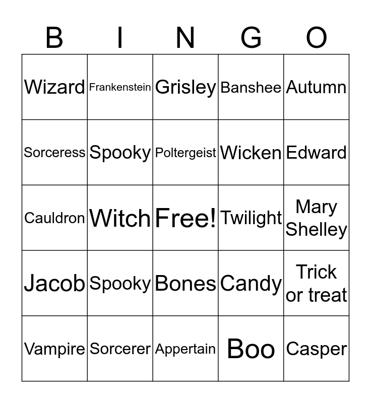 This bingo card has a free space and 24 words: Spooky, Sorcerer, Poltergeist, Vampire, Autumn, Wizard, Sorceress, Frankenstein, Twilight, Bones, Wicken, Cauldron, Candy, Trick or treat, Spooky, Boo, Mary Shelley, Grisley, Edward, Witch, Casper, Jacob, Banshee and Appertain.