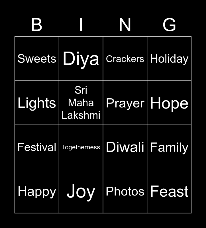 This bingo card has 16 words: Joy, Family, Crackers, Sweets, Festival, Diya, Diwali, Photos, Lights, Sri Maha Lakshmi, Happy, Holiday, Togetherness, Hope, Prayer and Feast.