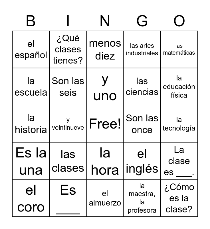 This bingo card has a free space and 71 words: el horario, ¿Qué clases tienes?, Yo tengo la clase de ___, la agricultura, el almuerzo, el arte, las artes industriales, la banda, las ciencias, las ciencias sociales, el coro, el culinario, la educación física, el español, el gobierno, la historia, el inglés, las matemáticas, la química, la tecnología, las clases, ¿Cómo es la clase?, La clase es ___., aburrida, difícil, divertida, fácil, importante, interesante, ¿Quién es?, Es ___, el director, la directora, el / la estudiante, la maestra, la profesora, el maestro, el profesor, ¿Adónde vas?, Yo voy a ___, la escuela, la universidad, la hora, ¿Qué hora es?, Es la una, Son las dos, Son las tres, Son las cuatro, Son las cinco, Son las seis, Son las siete, Son las ocho, Son las nueve, Son las diez, Son las once, Son las doce, el minuto, en punto, y uno, y cinco, y diez, y cuarto, y veinte, y veinticinco, y veintinueve, y media, menos uno, menos cinco, menos diez, menos cuarto, menos veinte, menos veinticinco and menos veintinueve.