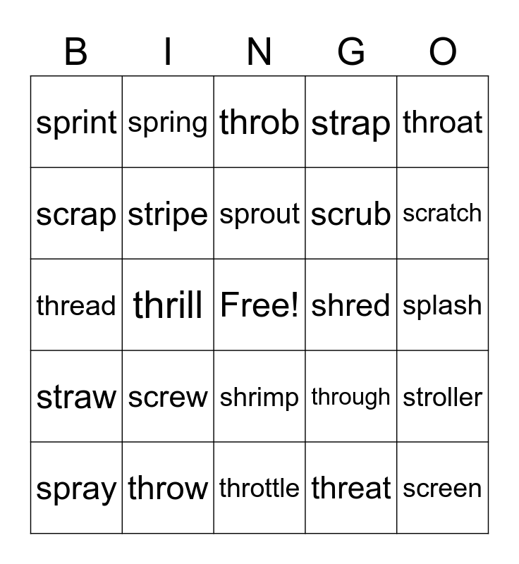 This bingo card has a free space and 29 words: spray, throne, thrill, scream, sprint, throb, stripe, screw, shred, throw, splash, screen, throttle, threat, scratch, split, shrimp, straw, throat, thread, through, three, scrub, scrap, strap, spring, stroller, sprout and shrug.