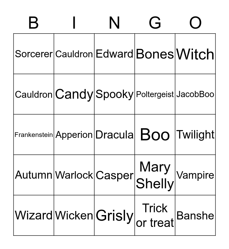 This bingo card has a free space and 24 words: Warlock, Wicken, Spooky, Wizard, Witch, Sorcerer, Cauldron, Cauldron, Boo, Casper, Poltergeist, Frankenstein, Mary Shelly, Vampire, Candy, Trick or treat, Twilight, Edward, JacobBoo, Apperion, Banshe, Autumn, Bones and Grisly.