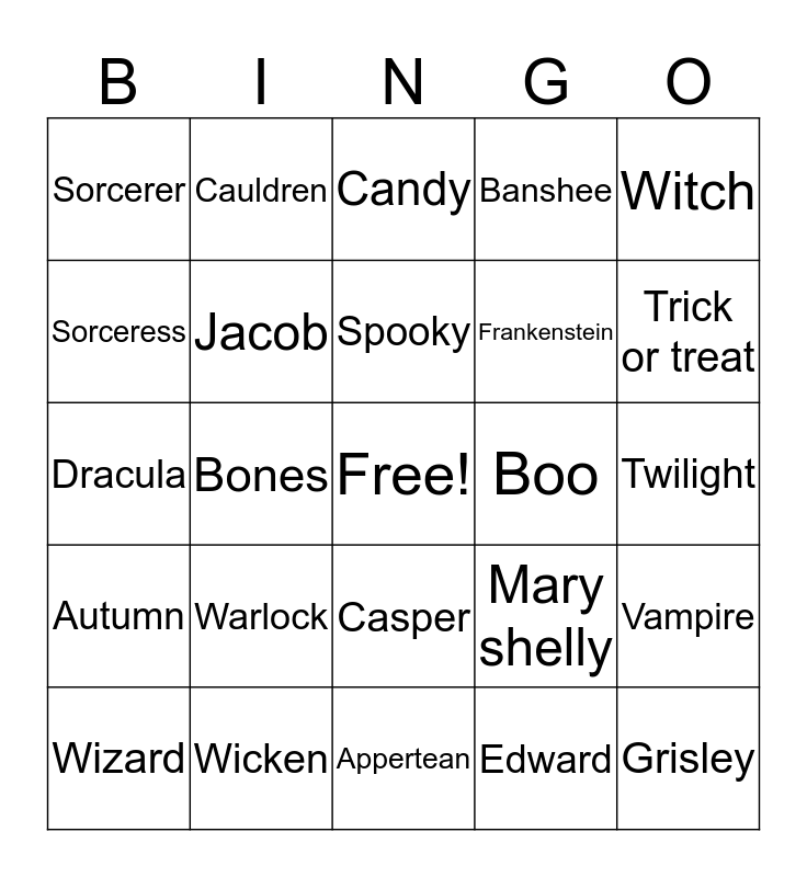 This bingo card has a free space and 24 words: Warlock, Wicken, Spooky, Wizard, Witch, Sorcerer, Sorceress, Cauldren, Boo, Casper, Frankenstein, Dracula, Mary shelly, Vampire, Jacob, Edward, Twilight, Candy, Trick or treat, Bones, Grisley, Autumn, Banshee and Appertean.