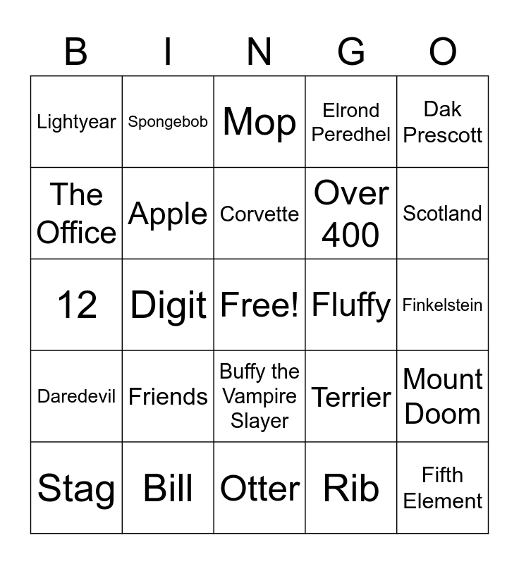 This bingo card has a free space and 41 words: 3, 12, Amy Rose, Apple, Bill, Buffy the Vampire Slayer, Corvette, Creeper, Dak Prescott, Daredevil, Digit, Elrond Peredhel, Fifth Element, Finkelstein, Fluffy, Friends, Jim, Lightyear, Lock, Mop, Mount Doom, Mr. Krabs, Otter, Over 400, Pidge, Pink, Rib, Sandy Cheeks, Scotland, Sean Astin, Snivellus, Spongebob, Stag, Star Wars, Terrier, The Office, The Time Warp, Tolkien, Tom Brady, Wednesday Addams and Zero.