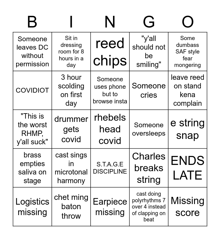 This bingo card has 25 words: cast sings in microtonal harmony, Earpiece missing, Someone uses phone but to browse insta, Logistics missing, Some dumbass SAF style fear mongering, Someone leaves DC without permission, COVIDIOT, Sit in dressing room for 8 hours in a day, Someone oversleeps, S.T.A.G.E DISCIPLINE, Someone cries, "This is the worst RHMP, y'all suck", Charles breaks string, ENDS LATE, 3 hour scolding on first day, Missing score, e string snap, reed chips, leave reed on stand kena complain, drummer gets covid, rhebels head covid, chet ming baton throw, brass empties saliva on stage, "y'all should not be smiling" and cast doing polyrhythms 7 over 4 instead of clapping on beat.