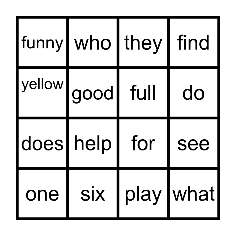 This bingo card has 16 words: six, see, they, funny, does, who, for, play, yellow, good, one, find, help, do, full and what.