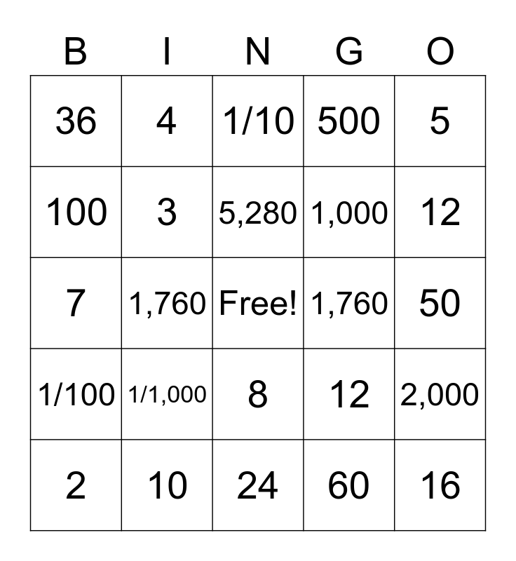 This bingo card has a free space and 24 words: 1/1,000, 10, 5,280, 2, 5, 36, 100, 4, 1,760, 8, 1,000, 7, 12, 2,000, 3, 60, 50, 1/10, 12, 1,760, 16, 1/100, 500 and 24.