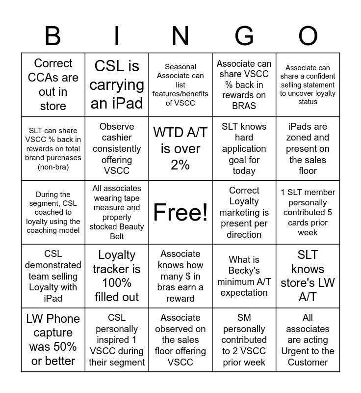 This bingo card has a free space and 24 words: Loyalty tracker is 100% filled out, CSL personally inspired 1 VSCC during their segment, WTD A/T is over 2%, LW Phone capture was 50% or better, Associate can share a confident selling statement to uncover loyalty status, Correct CCAs are out in store, SLT can share VSCC % back in rewards on total brand purchases (non-bra), CSL is carrying an iPad, Correct Loyalty marketing is present per direction, Associate knows how many $ in bras earn a reward, SLT knows hard application goal for today, During the segment, CSL coached to loyalty using the coaching model, What is Becky's minimum A/T expectation, SLT knows store's LW A/T, Observe cashier consistently offering VSCC, SM personally contributed to 2 VSCC prior week, 1 SLT member personally contributed 5 cards prior week, Seasonal Associate can list features/benefits of VSCC, iPads are zoned and present on the sales floor, All associates wearing tape measure and properly stocked Beauty Belt, All associates are acting Urgent to the Customer, CSL demonstrated team selling Loyalty with iPad, Associate can share VSCC % back in rewards on BRAS and Associate observed on the sales floor offering VSCC.