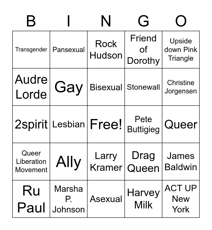 This bingo card has a free space and 24 words: Ally, Marsha P. Johnson, Bisexual, Ru Paul, Upside down Pink Triangle, Transgender, Audre Lorde, Pansexual, Pete Buttigieg, Larry Kramer, Stonewall, 2spirit, Drag Queen, James Baldwin, Gay, Harvey Milk, Queer, Rock Hudson, Christine Jorgensen, Lesbian, ACT UP New York, Queer Liberation Movement, Friend of Dorothy and Asexual.