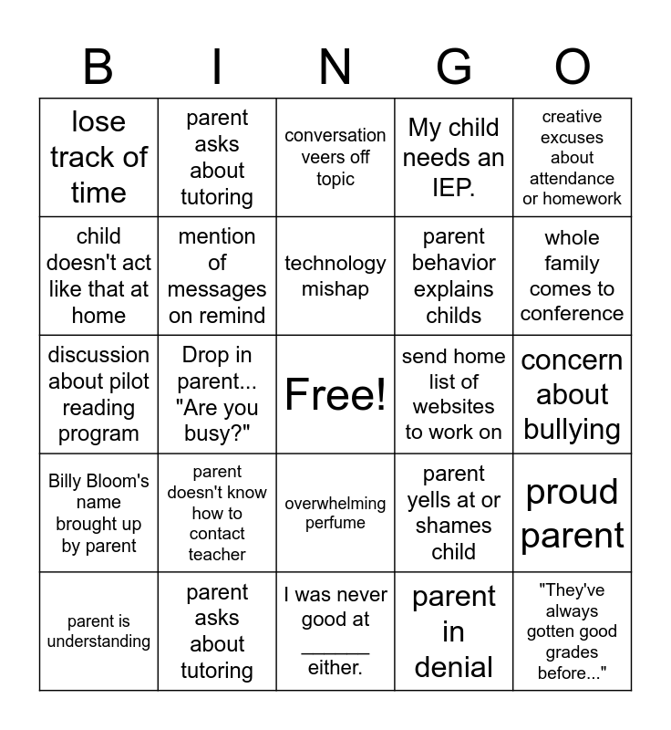 This bingo card has a free space and 29 words: parent is understanding, skepticism over common core, Drop in parent... "Are you busy?", no show, lose track of time, conversation veers off topic, mention of messages on remind, parent doesn't know how to contact teacher, send home list of websites to work on, parent asks about tutoring, concern about bullying, "They've always gotten good grades before...", I was never good at ______ either., parent in denial, whole family comes to conference, siblings destroy classroom, overwhelming perfume, Billy Bloom's name brought up by parent, creative excuses about attendance or homework, discussion about pilot reading program, parent yells at or shames child, parent upset with teacher, parent behavior explains childs, child doesn't act like that at home, My child needs an IEP., parent asks about tutoring, proud parent, technology mishap and Thank you for all you do..