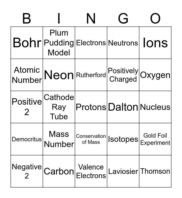 This bingo card has 25 words: Mass Number, Valence Electrons, Rutherford, Negative 2, Ions, Bohr, Atomic Number, Plum Pudding Model, Dalton, Conservation of Mass, Positively Charged, Positive 2, Isotopes, Gold Foil Experiment, Neon, Thomson, Nucleus, Electrons, Oxygen, Cathode Ray Tube, Protons, Carbon, Democritus, Neutrons and Laviosier.
