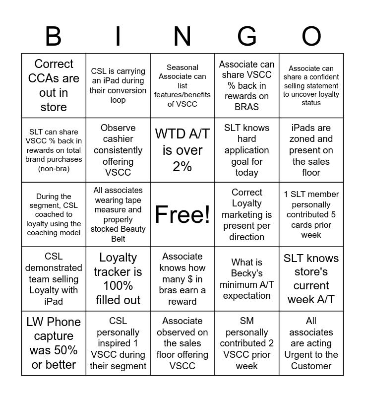 This bingo card has a free space and 24 words: Loyalty tracker is 100% filled out, CSL personally inspired 1 VSCC during their segment, WTD A/T is over 2%, LW Phone capture was 50% or better, Associate can share a confident selling statement to uncover loyalty status, Correct CCAs are out in store, SLT can share VSCC % back in rewards on total brand purchases (non-bra), CSL is carrying an iPad during their conversion loop, Correct Loyalty marketing is present per direction, Associate knows how many $ in bras earn a reward, SLT knows hard application goal for today, During the segment, CSL coached to loyalty using the coaching model, What is Becky's minimum A/T expectation, SLT knows store's current week A/T, Observe cashier consistently offering VSCC, SM personally contributed 2 VSCC prior week, 1 SLT member personally contributed 5 cards prior week, Seasonal Associate can list features/benefits of VSCC, iPads are zoned and present on the sales floor, All associates wearing tape measure and properly stocked Beauty Belt, All associates are acting Urgent to the Customer, CSL demonstrated team selling Loyalty with iPad, Associate can share VSCC % back in rewards on BRAS and Associate observed on the sales floor offering VSCC.