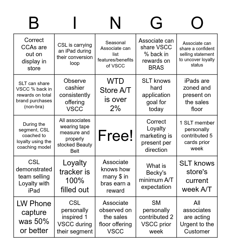 This bingo card has a free space and 24 words: Loyalty tracker is 100% filled out, CSL personally inspired 1 VSCC during their segment, WTD Store A/T is over 2%, LW Phone capture was 50% or better, Associate can share a confident selling statement to uncover loyalty status, Correct CCAs are out on display in store, SLT can share VSCC % back in rewards on total brand purchases (non-bra), CSL is carrying an iPad during their conversion loop, Correct Loyalty marketing is present per direction, Associate knows how many $ in bras earn a reward, SLT knows hard application goal for today, During the segment, CSL coached to loyalty using the coaching model, What is Becky's minimum A/T expectation, SLT knows store's current week A/T, Observe cashier consistently offering VSCC, SM personally contributed 2 VSCC prior week, 1 SLT member personally contributed 5 cards prior week, Seasonal Associate can list features/benefits of VSCC, iPads are zoned and present on the sales floor, All associates wearing tape measure and properly stocked Beauty Belt, All associates are acting Urgent to the Customer, CSL demonstrated team selling Loyalty with iPad, Associate can share VSCC % back in rewards on BRAS and Associate observed on the sales floor offering VSCC.