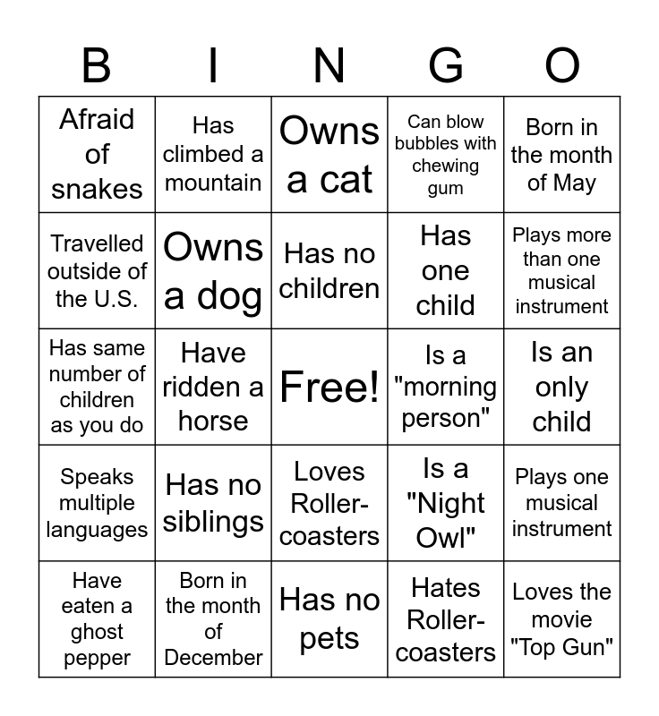 This bingo card has a free space and 24 words: Has no siblings, Born in the month of December, Has no children, Have eaten a ghost pepper, Born in the month of May, Afraid of snakes, Travelled outside of the U.S., Has climbed a mountain, Is a "morning person", Loves Roller-coasters, Has one child, Has same number of children as you do, Is a "Night Owl", Plays one musical instrument, Owns a dog, Hates Roller-coasters, Is an only child, Owns a cat, Plays more than one musical instrument, Have ridden a horse, Loves the movie "Top Gun", Speaks multiple languages, Can blow bubbles with chewing gum and Has no pets.
