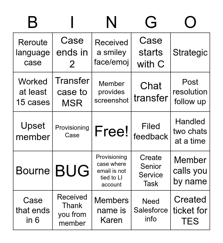 This bingo card has a free space and 29 words: Case that ends in 6, Troubleshoot CCC, Provisioning Case, Limited Listing / Basic Job, Reroute language case, Received a smiley face/emoj, Transfer case to MSR, BUG, Filed feedback, Received Thank you from member, Handled two chats at a time, Created ticket for TES, Members name is Karen, Need Salesforce info, Post resolution follow up, Member says "Fix this now, Provisioning case where email is not tied to LI account, Bourne, Strategic, Upset member, Create Senior Service Task, Not enough information, Chat transfer, Worked at least 15 cases, Case starts with C, Case ends in 2, Member calls you by name, Member provides screenshot and Happy member.