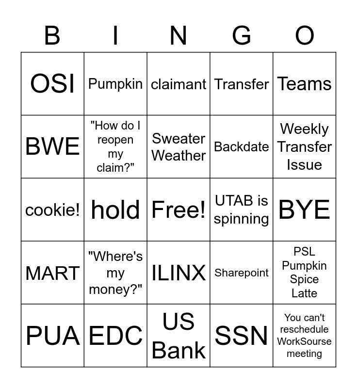 This bingo card has a free space and 29 words: PUA, EB, hold, CTS Language Services, OSI, claimant, "How do I reopen my claim?", "Where's my money?", UTAB is spinning, EDC, BYE, You can't reschedule WorkSourse meeting, US Bank, SSN, Weekly Transfer Issue, NGTS, ILINX, MART, Teams, cookie!, Sharepoint, Timely Claiming, Backdate, BWE, Transfer, Pumpkin, PSL Pumpkin Spice Latte, Sweater Weather and Daylight Savings.
